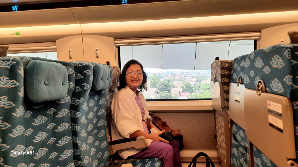 Suasana didalam gerbong kereta cepat Whoosh yang terkesan modern dan keren.
